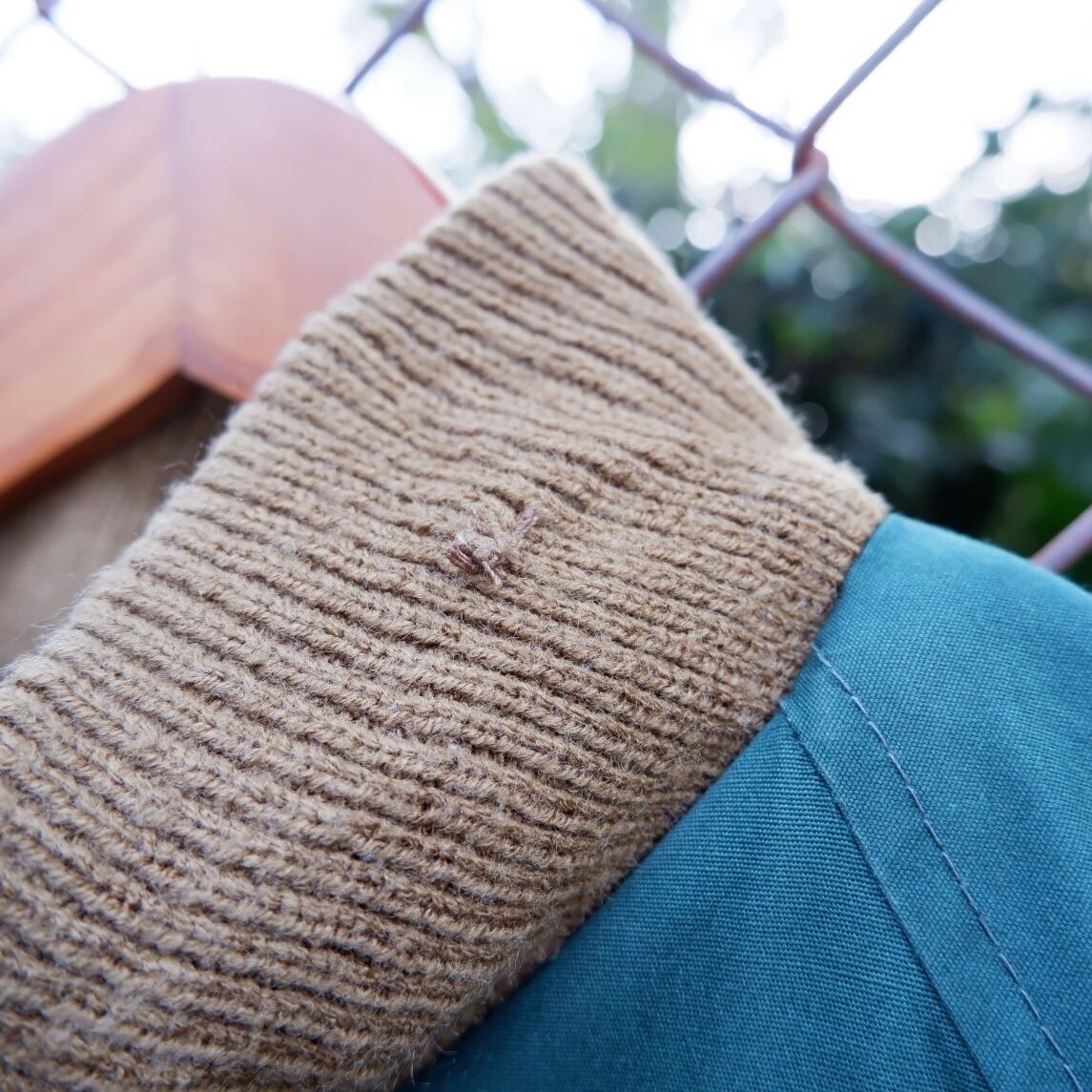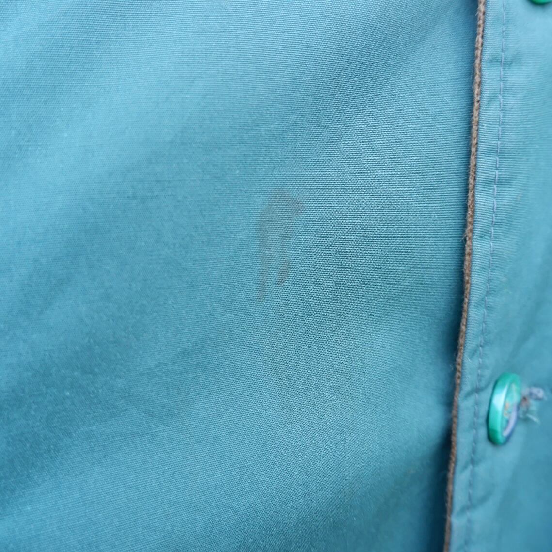 フロント、両袖に汚れ、第3、第4ボタンホールにダメージがあります。